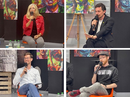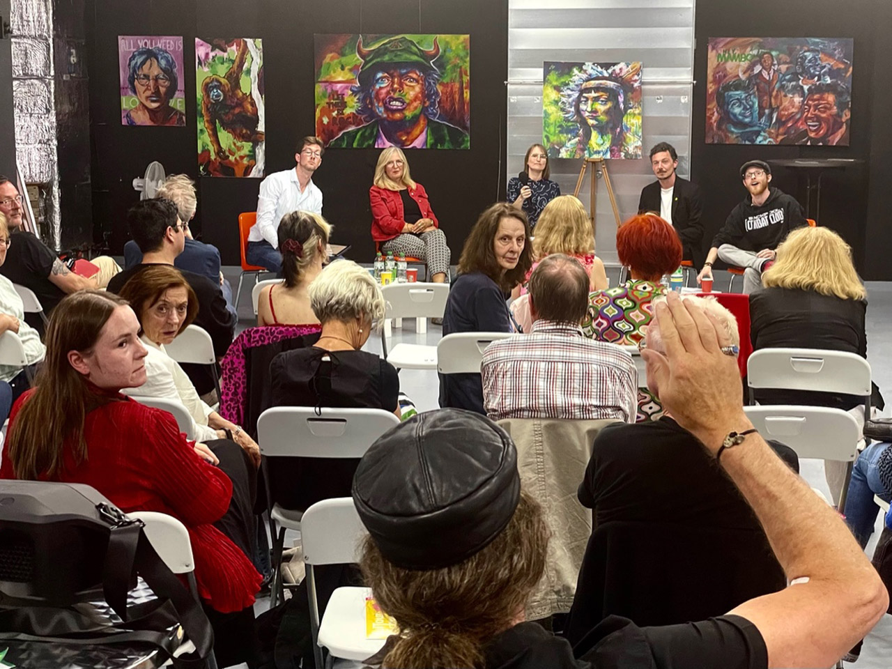 Vor der Kunst-Kulisse der KIS-KulTour-Ausstellung in dem Raum The Stage der isg-schwerte entspann sich eine rege und interessante Diskussion, professionell moderiert von Astrid Hoffmann aus dem Kernteam der Kulturinitiative.