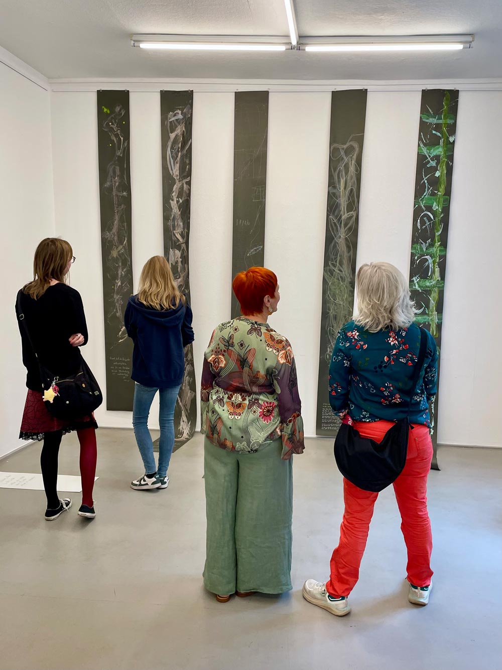Im Anschluss berichteten die beiden Künstlerinnen von ihrem manchmal unruhigen Künstlerdasein, von kurzer, großer Schaffenslust und langen Kreativblockaden. Sie schilderten, dass sie sich zeitweise als eine Art „Medium“ erleben, fast dazu gedrängt, Energien, Impulse und damit aktuelle Themen aus der Gesellschaft als vermittelndes Element aufzugreifen.