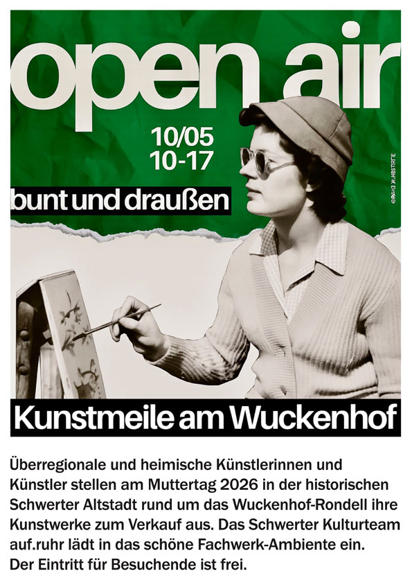 „Die traditionsreiche Kunstmeile in Schwerte ist für viele Besucherinnen und Besucher mit Freude an Kunst zu einer festen Marke geworden“, betont das Orga-Team und schickt in diesem Zuge auch einen Dank an den Kultur- und Weiterbildungsbetrieb Schwerte (KuWeBe) für die Kooperation zur Nutzung des Wuckenhof-Platzes.